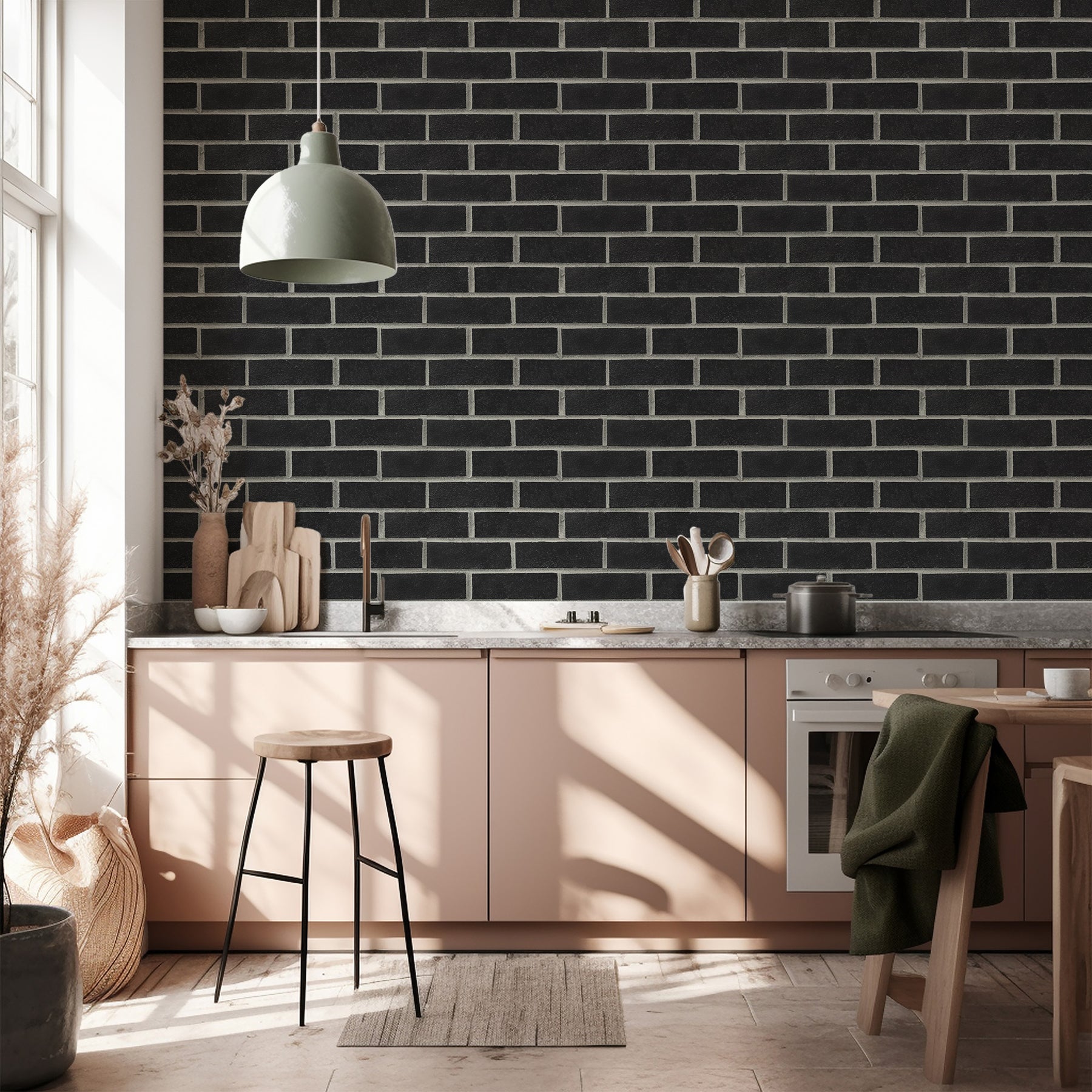 But you don’t have to live in an NYC loft to get the industrial look. A faux brick wallpaper like the subway black brick wallpaper can instantly add industrial charm to your spaces, especially when highlighted as in accent wall or kitchen backsplash.