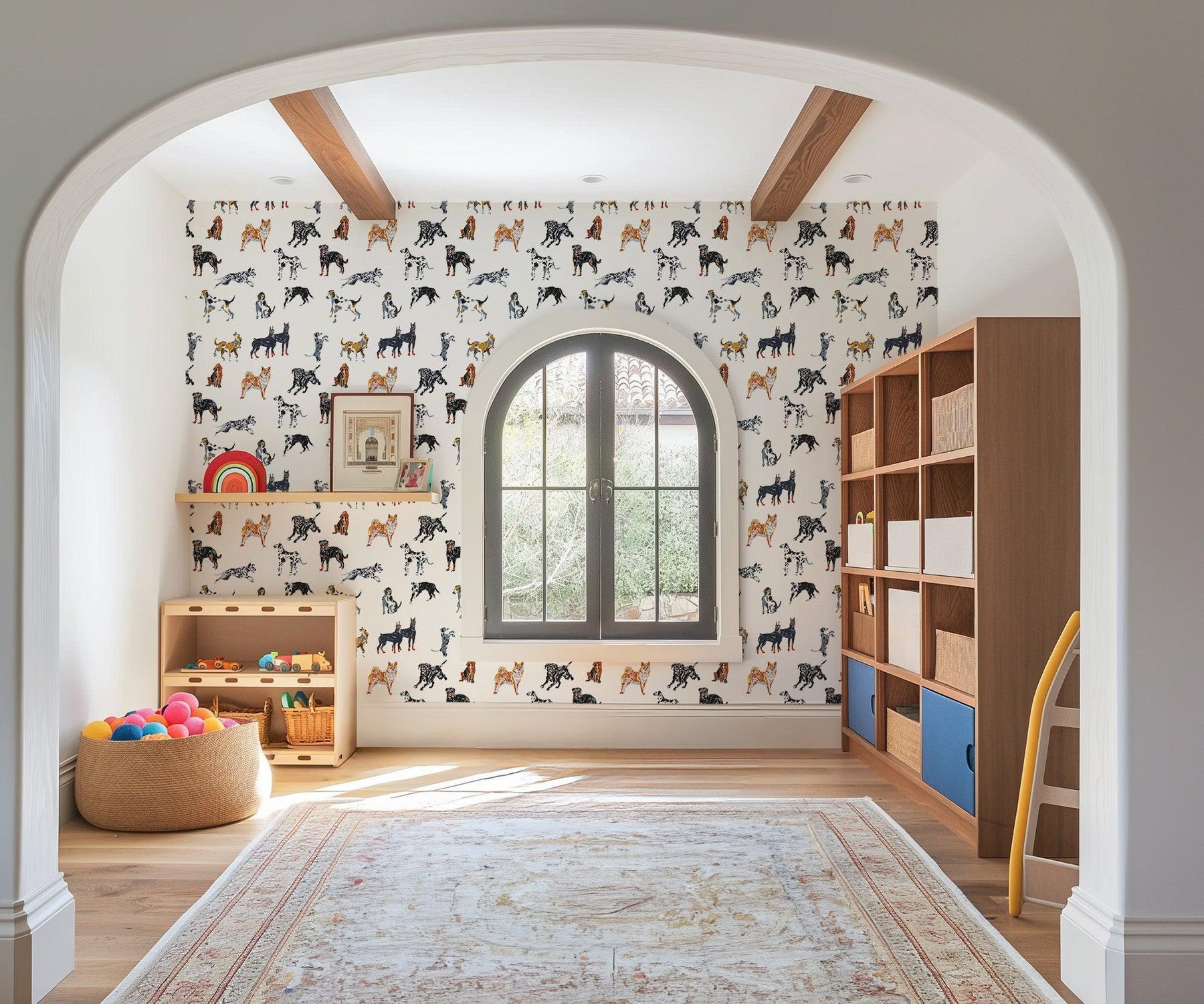 The dog days sketchpad white wallpaper is the perfect choice if you want something that pairs well with white and neutral colors–or if your kid just loves puppies.