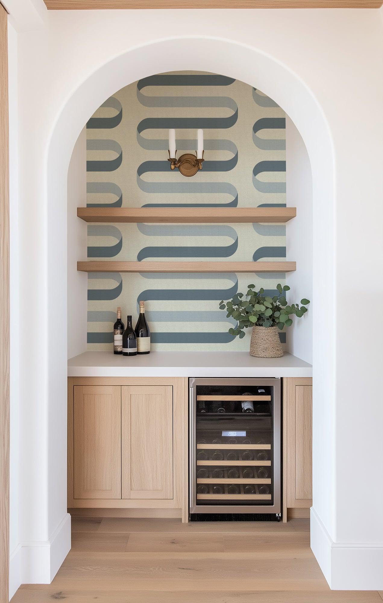 Accent wallpaper can act as a focal point, drawing the eye toward specific features. For example, you might choose calming retro wallpaper like the folding ribbon off white blue wall paper to frame your bed in a primary bedroom. Or, if you have a large fireplace in your living room, consider highlighting it with a dramatic pattern.