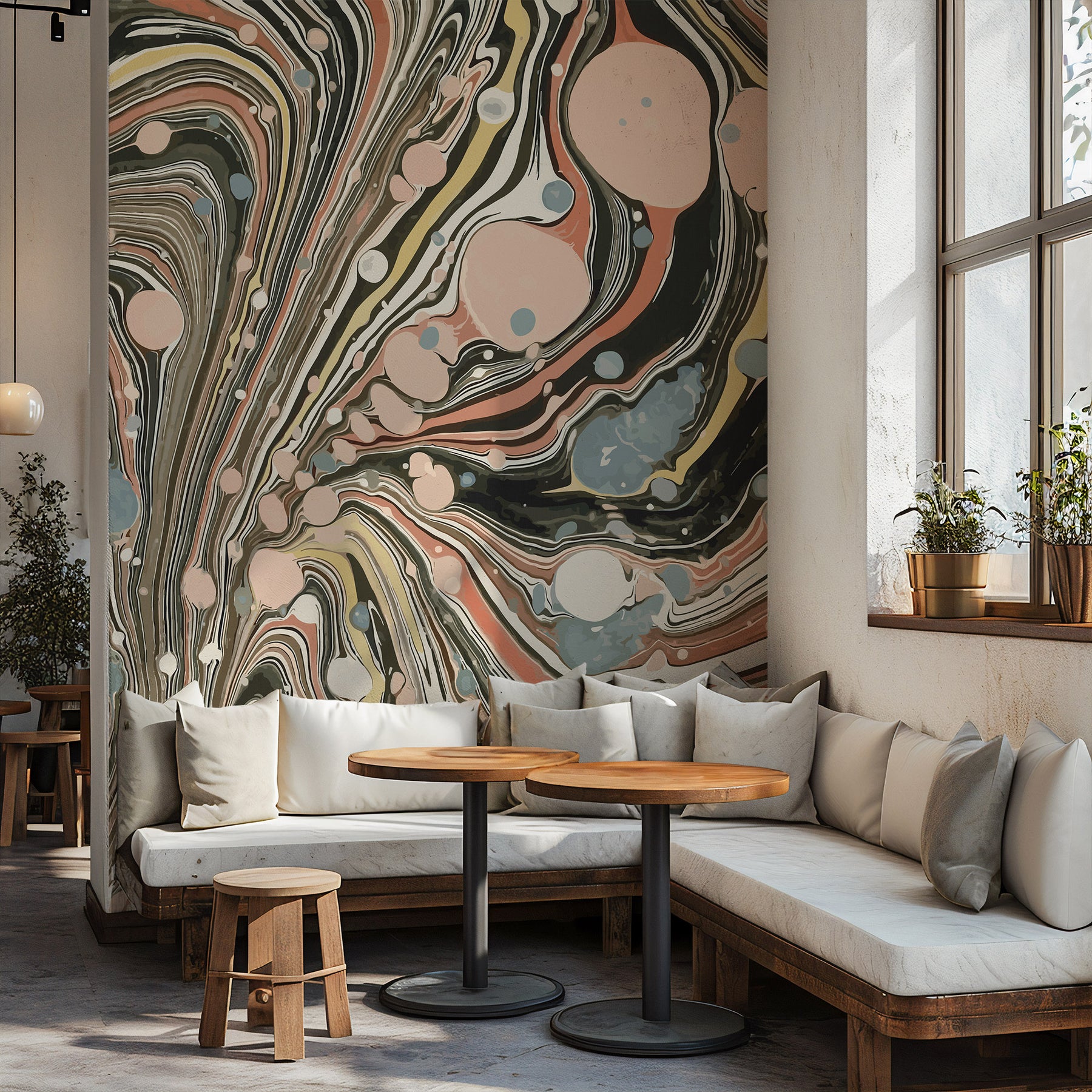 Marble-effect wallpapers with rich, swirling colors like teal, ruby, and deep purple create a sense of fluidity in a room. This take on the Mix and Maximalist design is perfect for those who love a high-impact aesthetic and want to step away from any traditional motifs.