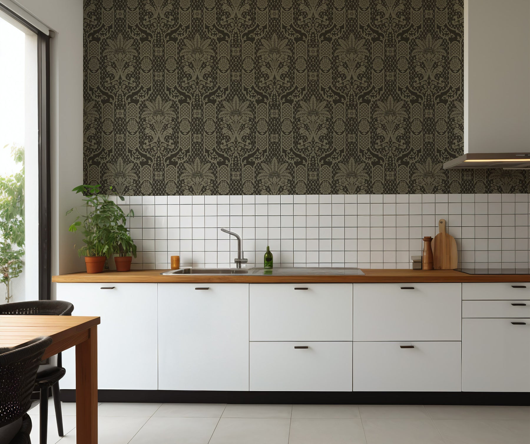 Moreover, you may want darker hues for places that are prone to stains, such as kitchens. So, if you want to make your cooking space visually stunning at all times, you may want to consider a wallpaper design such as Columnar Bloom - Golden Knight. This is the perfect wallpaper for chic kitchens that need a “wow” effect.
