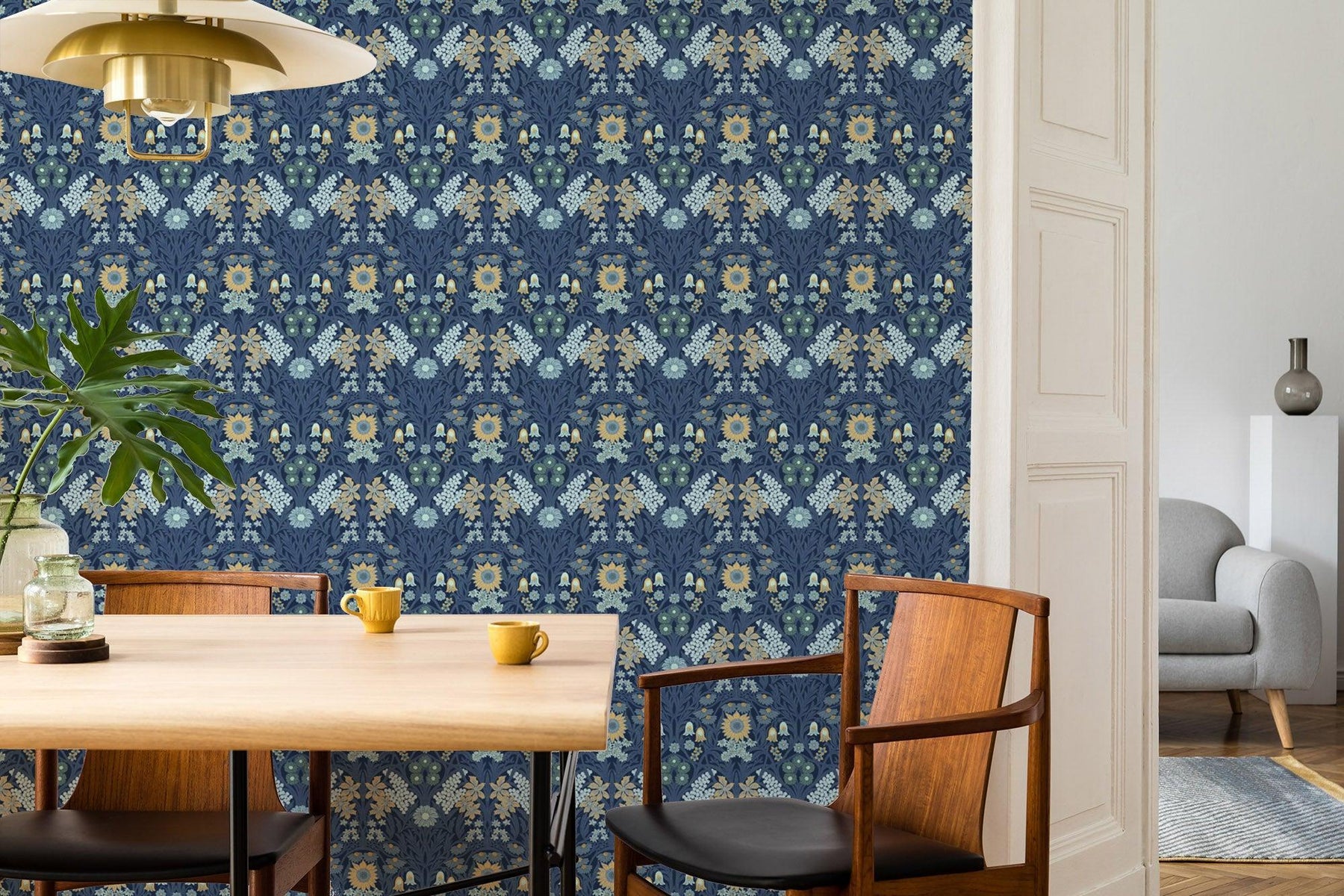 For example, the wild meadow wallpaper in indigo blue uses a layered blossom pattern to create a spectacular design that’s ideal for a winter-inspired interior. The soft shapes, rich blue background, and ornate presentation make the design almost look like a field of ornaments, while the subtle pops of muted yellow create a sense that spring is just around the corner.