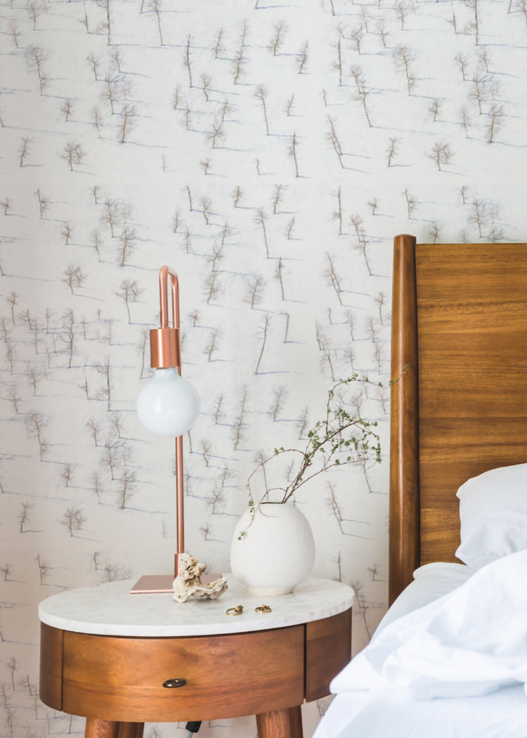The birch trees wallpaper celebrates the calm stillness of midwinter. By depicting trees of various heights, sizes, and placements, this stunning wallpaper creates an atmosphere that feels both minimalistic and rugged.