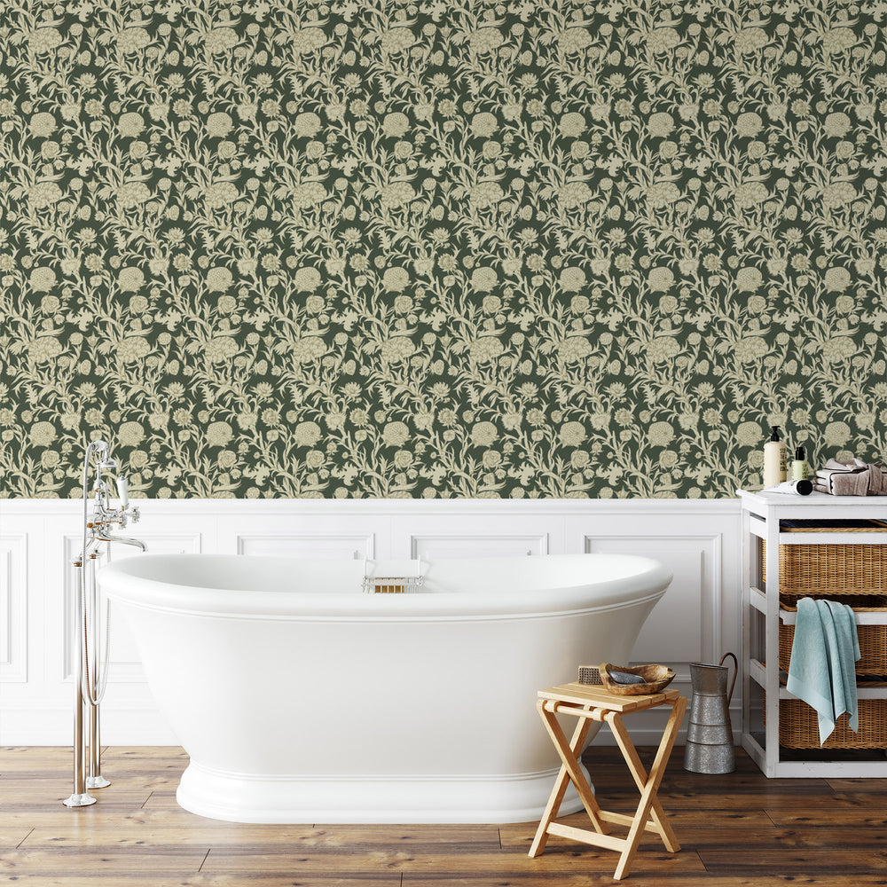 Dense stems and blossoms layer into a tapestry of natural abundance. The pattern captures the tangle of hedgerow and meadow, edited into clarity without losing richness. Looking closer, new details continue to surface, keeping the design alive on the wall.