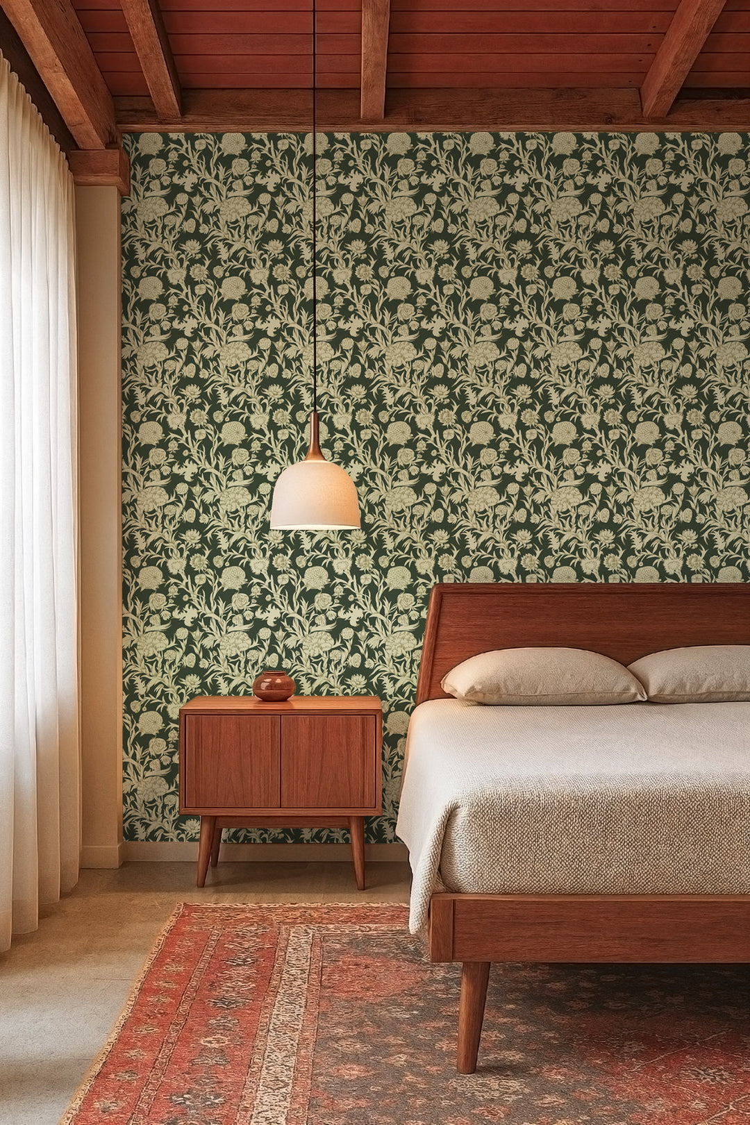 The Patterned Garden follows the Arts & Crafts movement ideal that design begins with nature and ends in the home. Dense thickets, ordered vines, and poised florals offer different scales of pattern, all sharing a clear underlying structure. The result is ornament that reads quietly from afar and rewards attention up close.