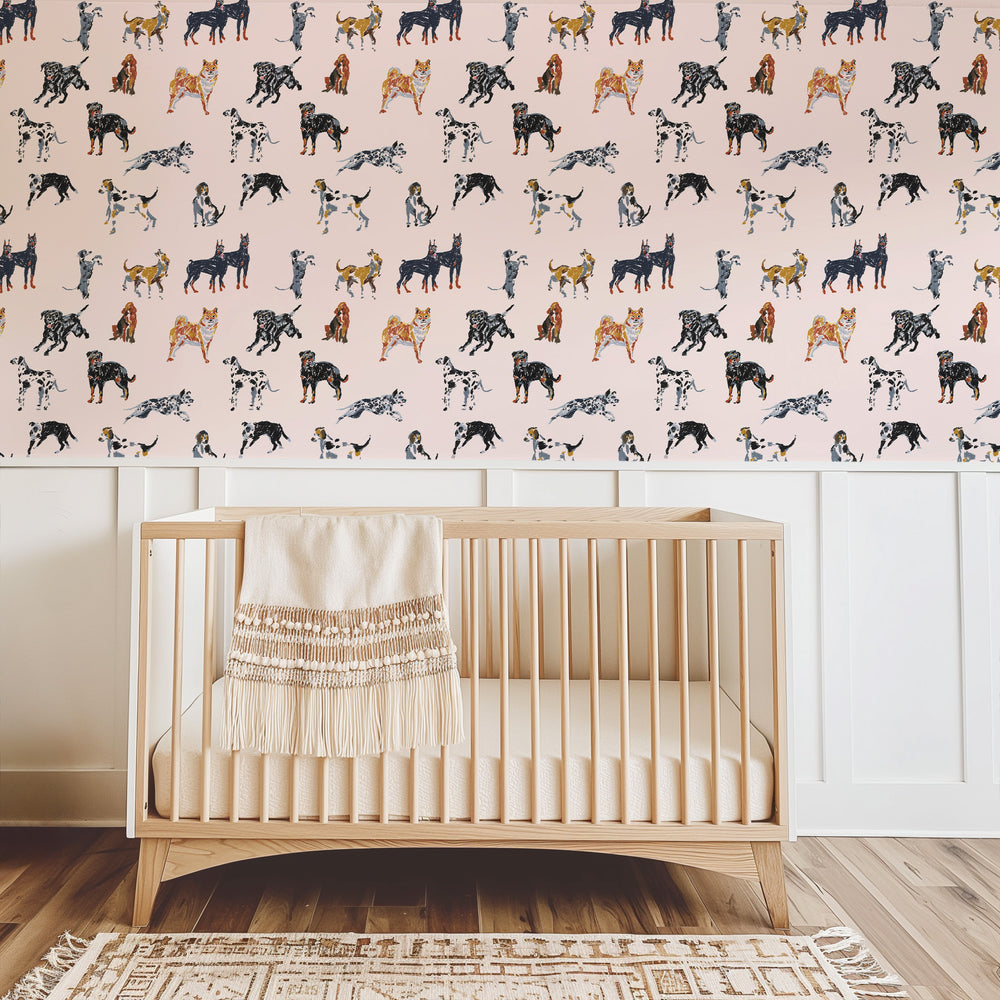 A lively pattern featuring expressive dog breeds in playful poses, originally rendered in charming crayon drawings. This design adds energy and playful character to any room.