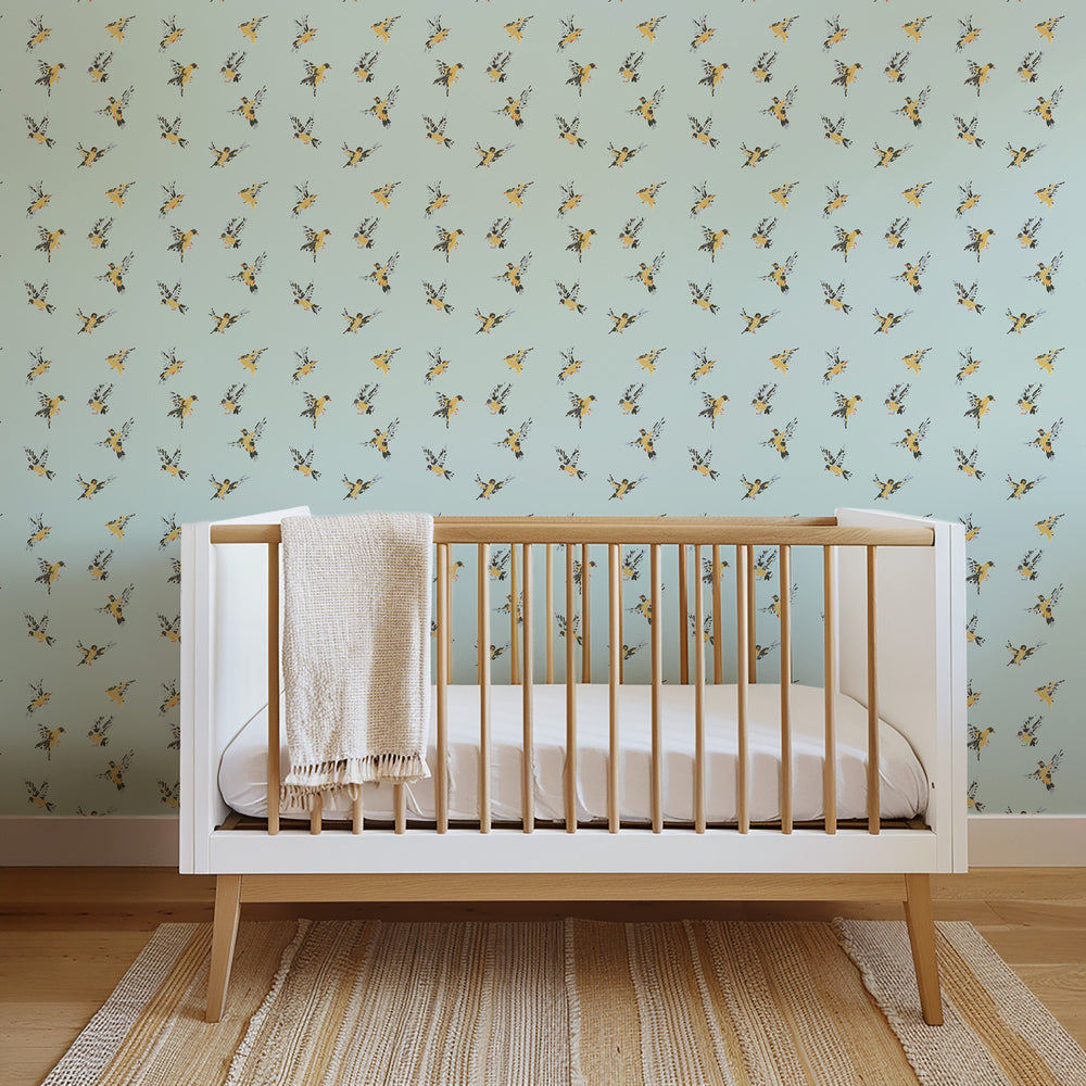 A delicate design showcasing finches in mid-flight, capturing their graceful motion and natural elegance. Originally drawn in watercolor crayons, this pattern brings a hand-crafted, artistic touch to interiors.