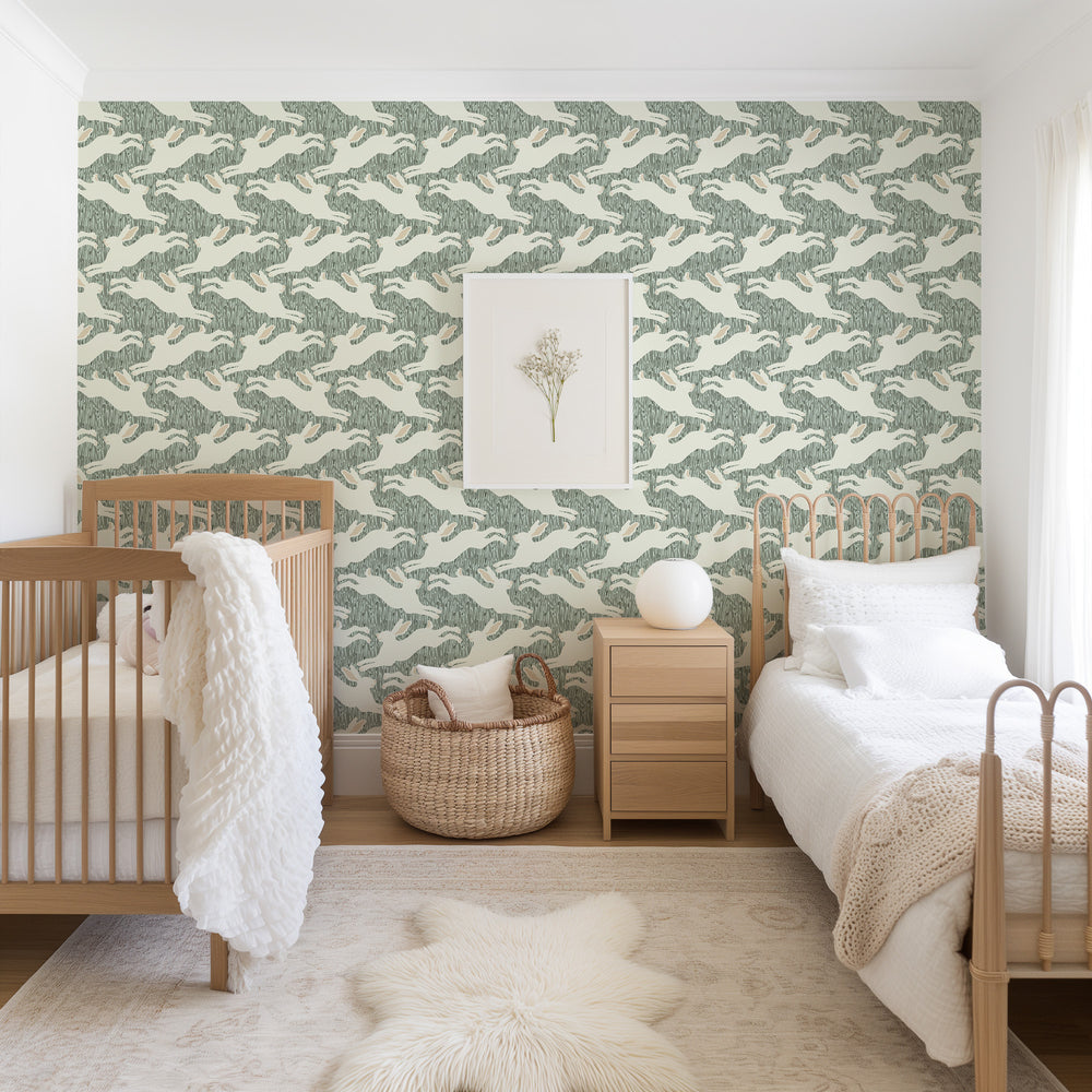 A whimsical arrangement of leaping hares, evoking movement and playful charm against a meadow-inspired backdrop. Perfect for creating a lighthearted and stylish atmosphere.