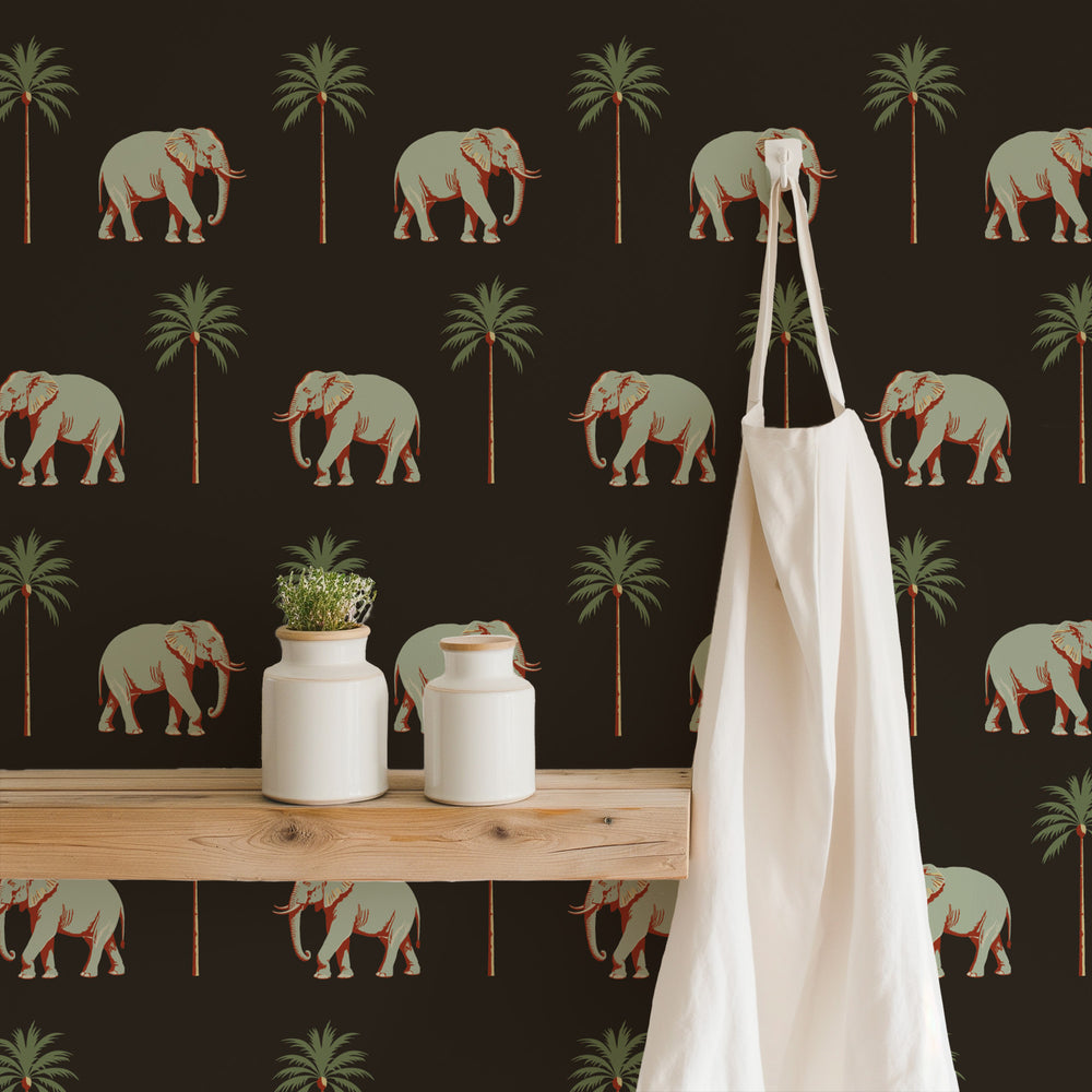 A refined yet playful design featuring elephants in gentle stride, paired with stately palm motifs. This pattern brings a sense of classic luxury and natural charm to any interior.
