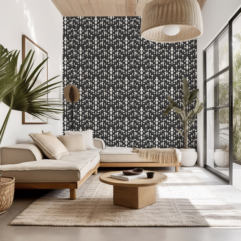 Our Boho Rain - Ivory On Black pattern. The carefree vibe of Charlotte designer, Wendy Fennell of Bohemian Bungalow Design is on full display in this collection of color drenched wallpaper patterns to suit those who like their home design to reflect bold and beautiful! Oversized patterns, saturated color and balanced design flow throughout this collection.
