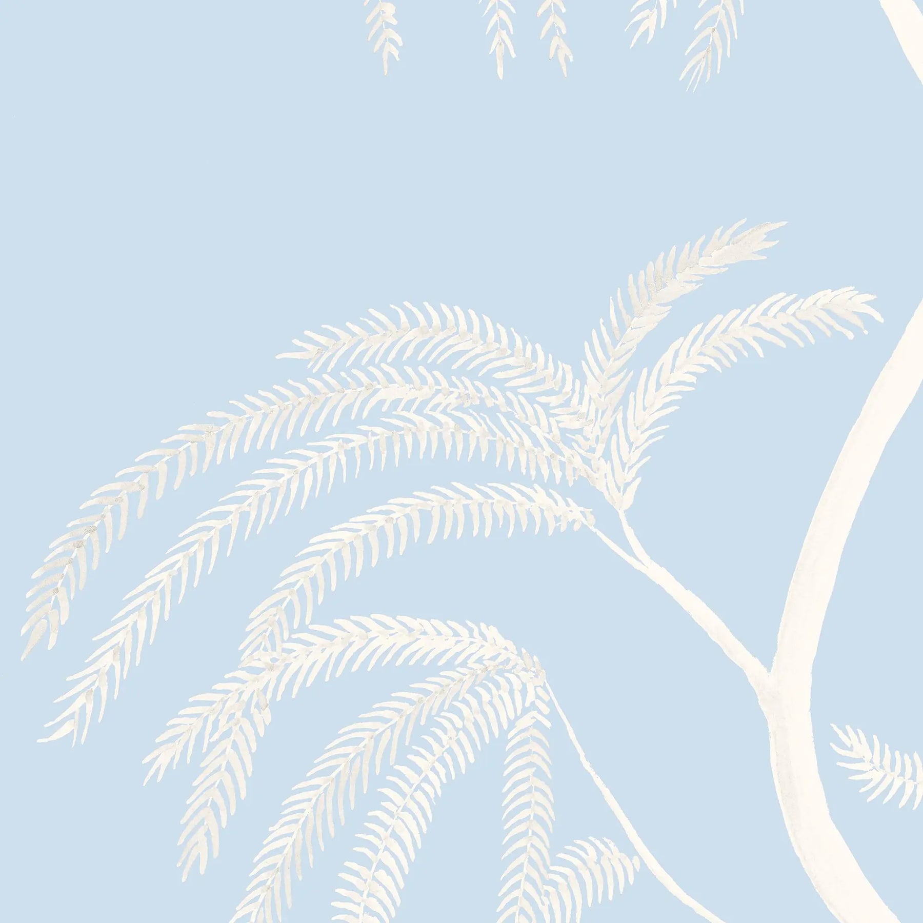 Leaning Orchard is a watercolor chinoiserie mural featuring willows, windswept evergreens, citrus trees, pomegranate branches, and a leaning yuzu tree. Delicate flowers and perched birds are woven throughout, creating small details for the eye to wander and discover.