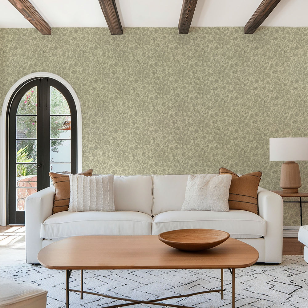 Wandervine presents a bold, untamed design with twisting vines, leaves, and intricate botanical shapes. This unconventional floral pattern is perfect for creating a dramatic and evocative atmosphere.