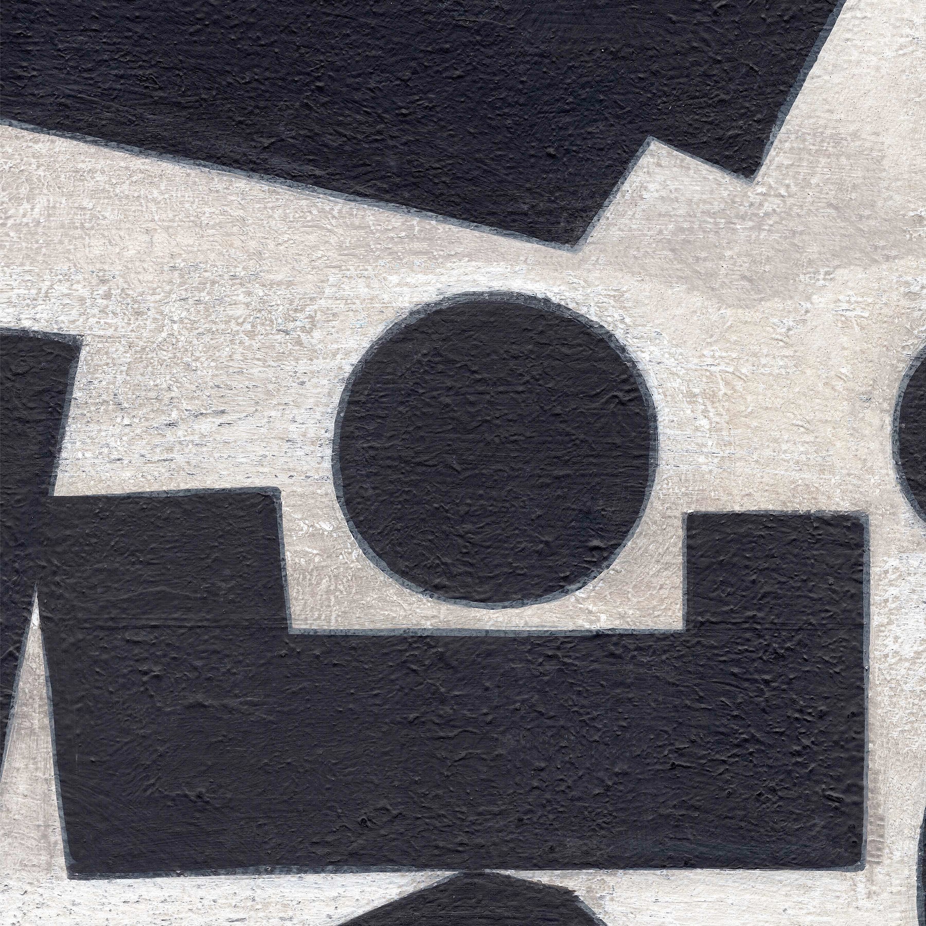 'Revelation' - Bold contrast and form define this collage of abstract geometric shapes. Hand-painted edges and a weathered backdrop lend tactile authenticity and a sculptural quality, creating a striking focal point that energizes and elevates any room.