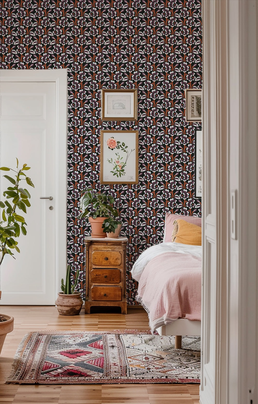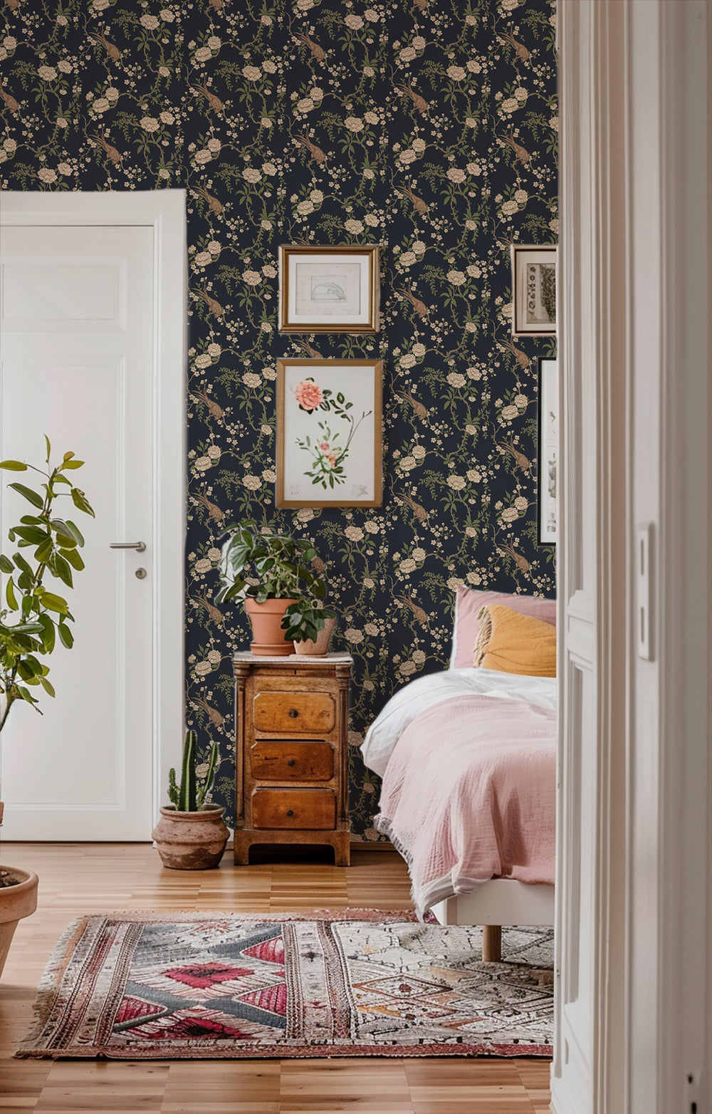 Bold Accent Walls: Transform bedrooms or living rooms with a dramatic vibrant wallpaper behind your bed, sofa, or dining table.