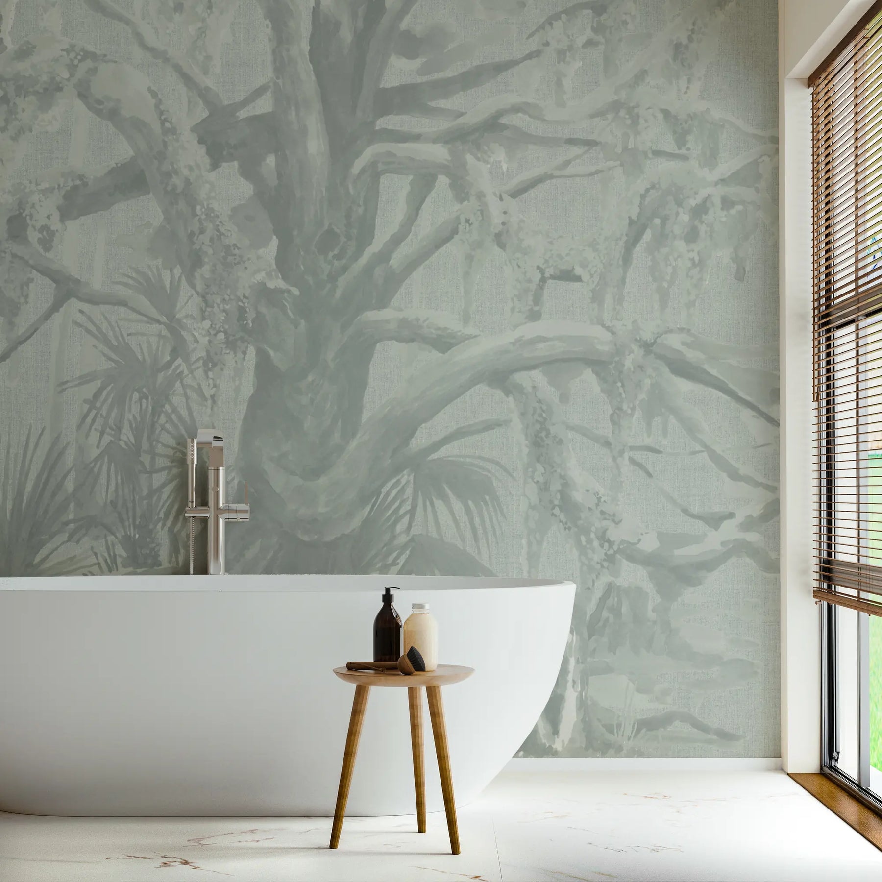 The beauty of the Lowcountry comes to life in Kiawah Oaks, a mural that captures the easy, organic feel of a Southern swamp. The trees twist and stretch, the moss drapes like lace, and the palmetto palms add a grounding touch. The hand-painted watercolor style keeps it soft and inviting, perfect for adding a touch of nature to any space. Its grand scale brings depth and movement, making the room feel like a window into the wild.