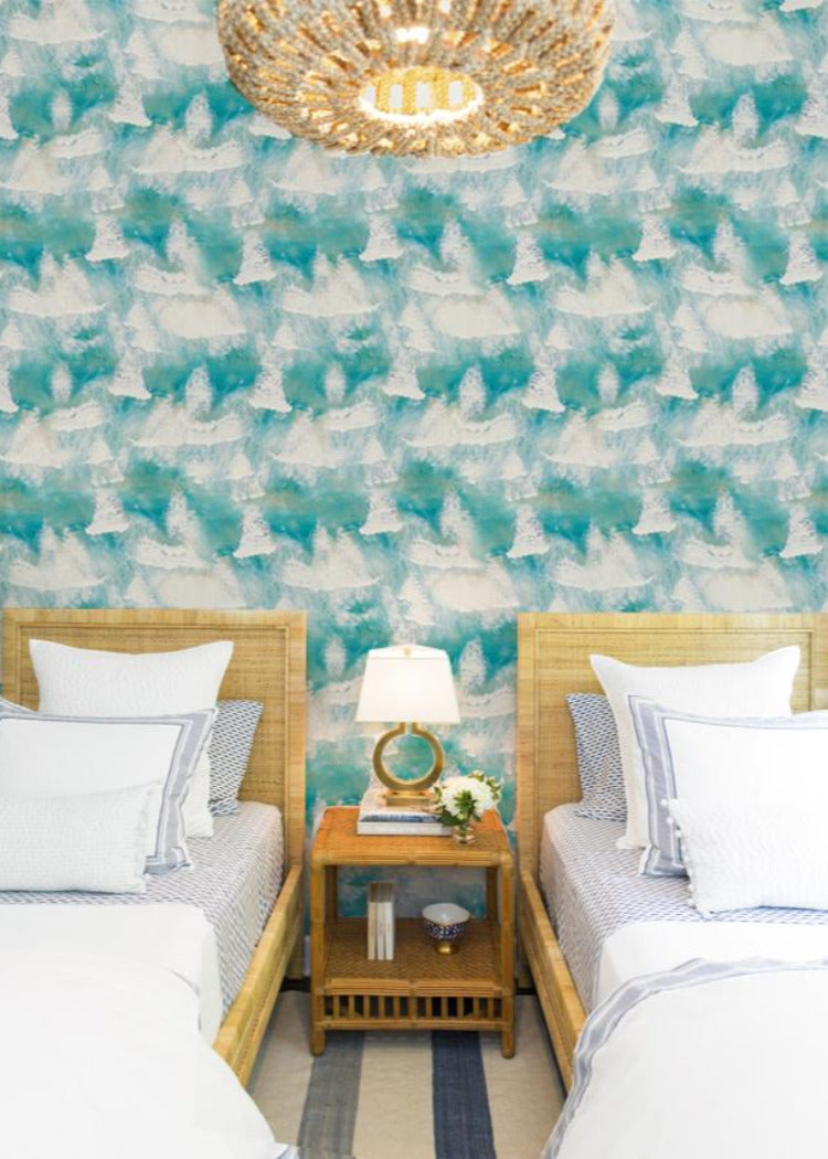 Captivating layers of ocean waves off the coast of Byron Bay, Australia are seen in the Ocean Waves pattern. Featuring varying colors of aqua with patterned white wave caps, slight colors of sand can be seen peeking through the shallow waters.
