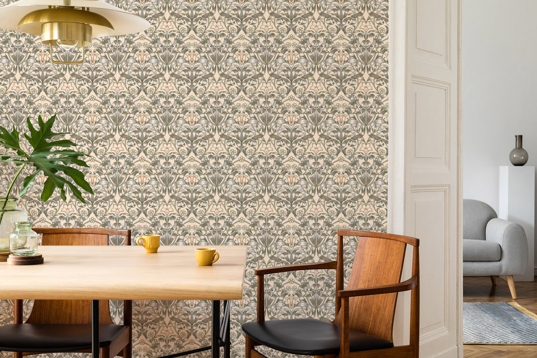 The Patterned Garden follows the Arts & Crafts movement ideal that design begins with nature and ends in the home. Dense thickets, ordered vines, and poised florals offer different scales of pattern, all sharing a clear underlying structure. The result is ornament that reads quietly from afar and rewards attention up close.