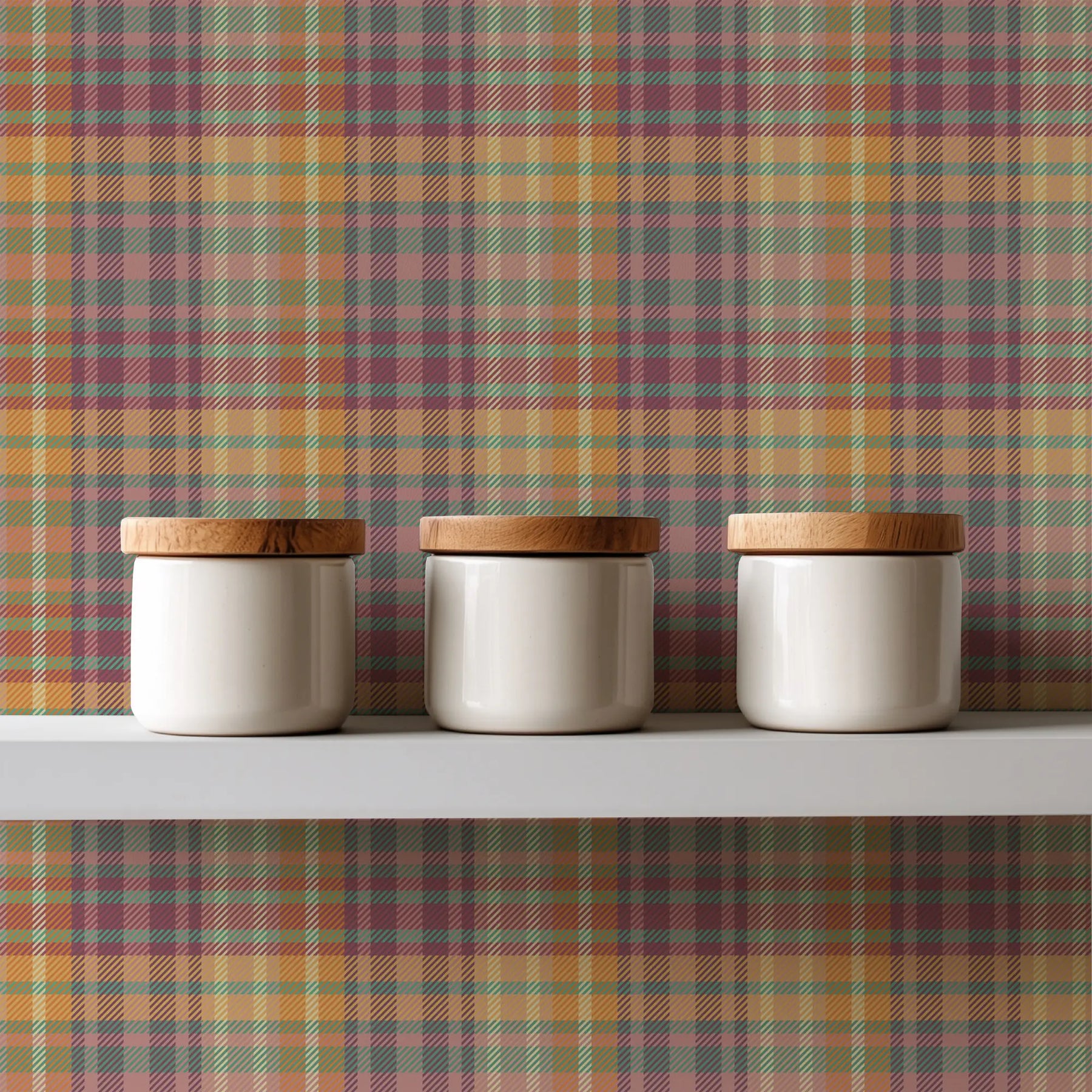 A warm, layered plaid inspired by traditional textiles, blending sun-faded harvest tones with painterly striping for a lively yet interior-friendly take on classic woven checks.