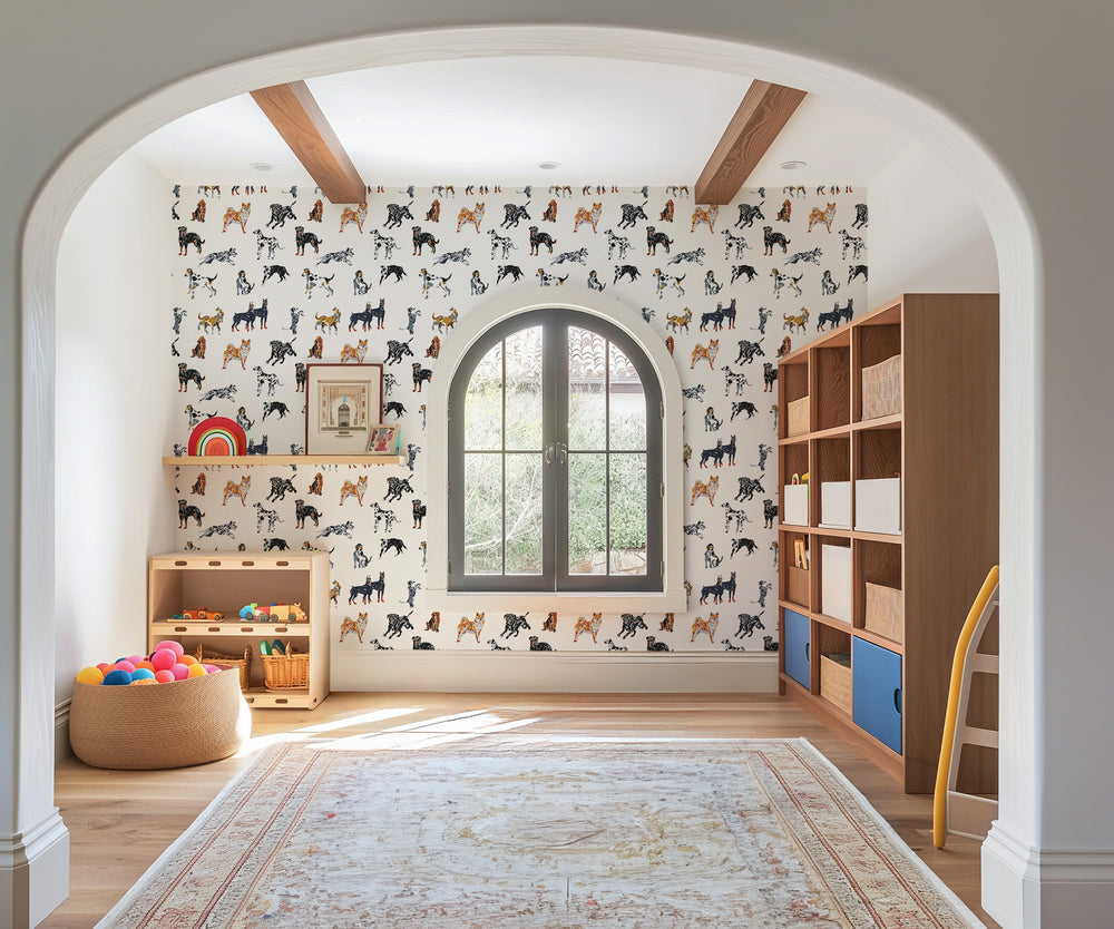 A lively pattern featuring expressive dog breeds in playful poses, originally rendered in charming crayon drawings. This design adds energy and playful character to any room.