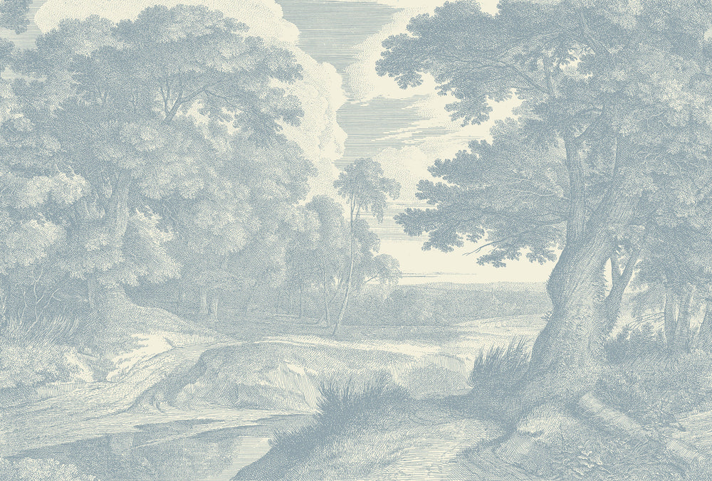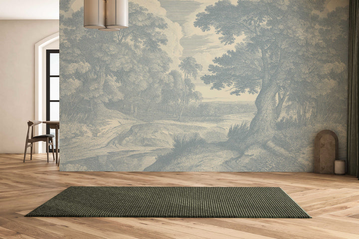 Drawn from a 17th-century vision of myth and landscape, this mural presents a wooded glade where terrain, water, and atmosphere unfold in deliberate harmony. A forest springs open around a central source—quiet, composed, and suggestive of timeless ritual. The composition balances organic form with architectural rhythm, evoking a landscape shaped by both nature and memory.