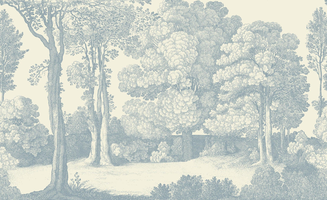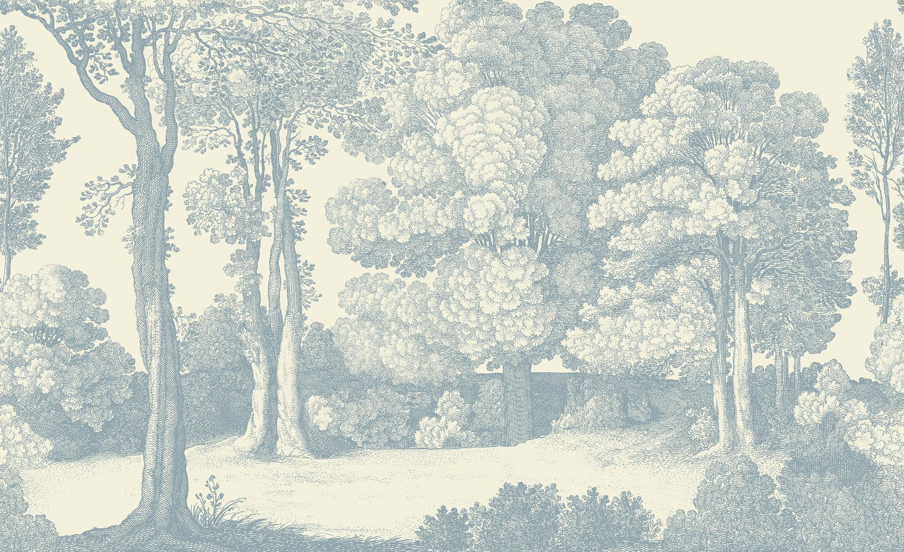 Drawn from a classical etching, this mural depicts a forested spring rendered with precision and restraint. Trees cluster around a gentle clearing, and the terrain unfolds with quiet balance—each element finely structured yet understated. The composition reflects early landscape draftsmanship, where natural forms are treated with architectural calm and clarity.