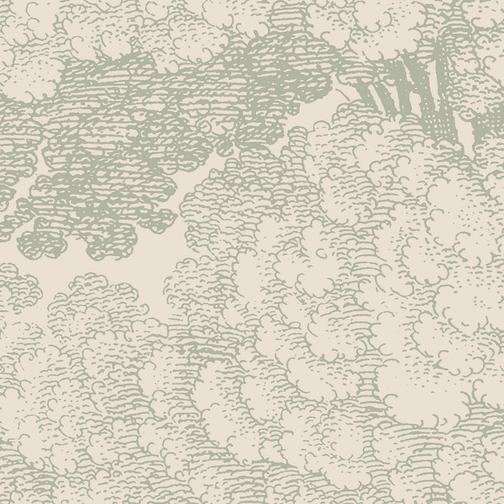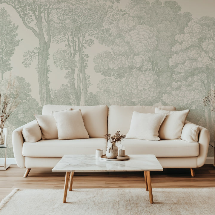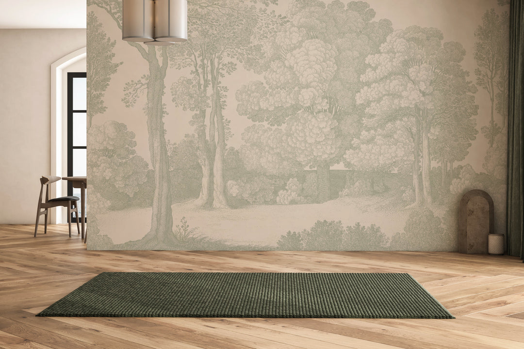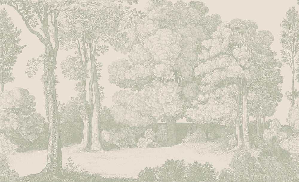 Drawn from a classical etching, this mural depicts a forested spring rendered with precision and restraint. Trees cluster around a gentle clearing, and the terrain unfolds with quiet balance—each element finely structured yet understated. The composition reflects early landscape draftsmanship, where natural forms are treated with architectural calm and clarity.