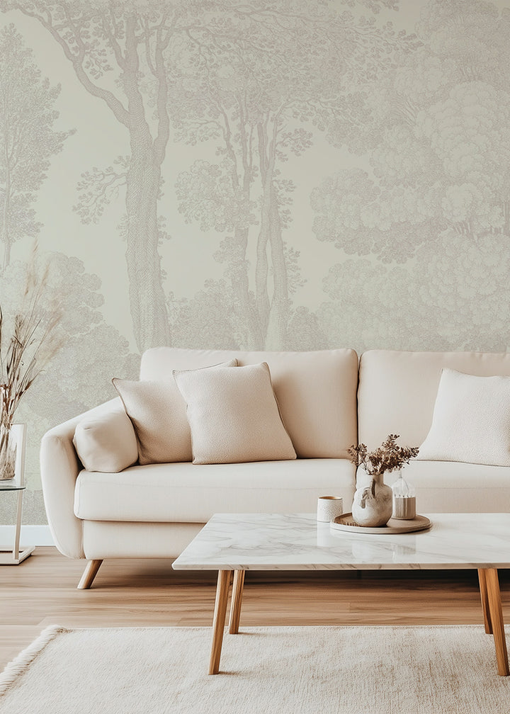 Drawn from a classical etching, this mural depicts a forested spring rendered with precision and restraint. Trees cluster around a gentle clearing, and the terrain unfolds with quiet balance—each element finely structured yet understated. The composition reflects early landscape draftsmanship, where natural forms are treated with architectural calm and clarity.