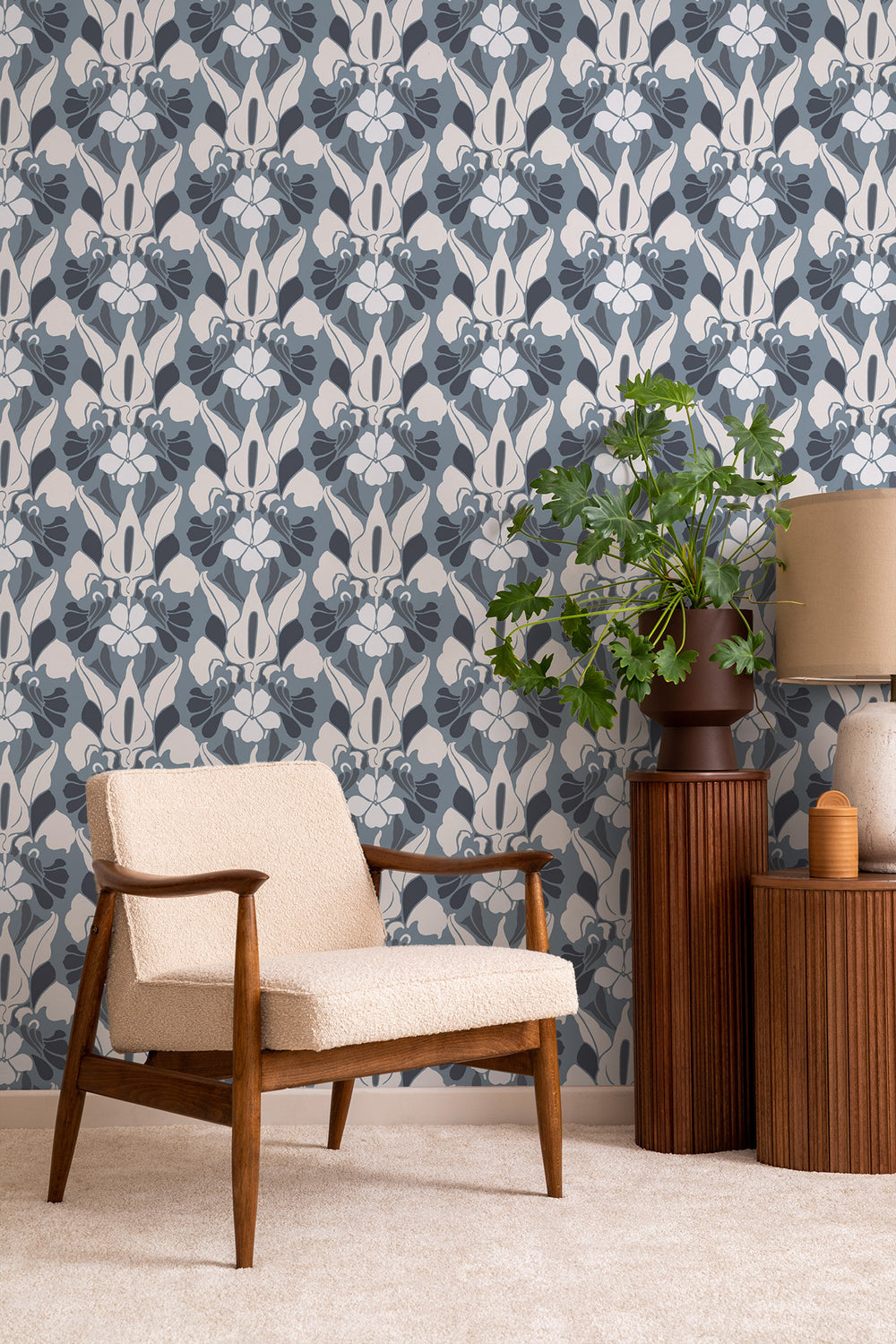 Dragon Flower - White/Blue/Grey Floral Wallpaper