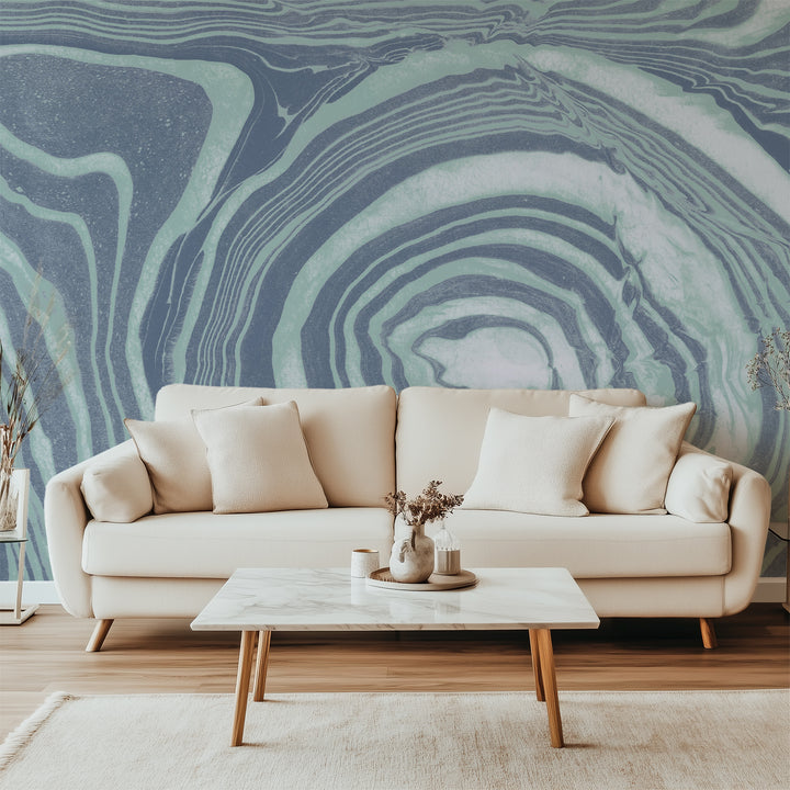 The marbleized pattern mural features swirls of deep and light blue tones, creating a fluid, dynamic design reminiscent of ocean waves or abstract stone formations. Lush veins can be seen through the blue, adding texture and depth to the artwork. The colors blend seamlessly, creating a soothing yet striking visual effect. This mural evokes a sense of calm and movement, making it an elegant focal point for any space.