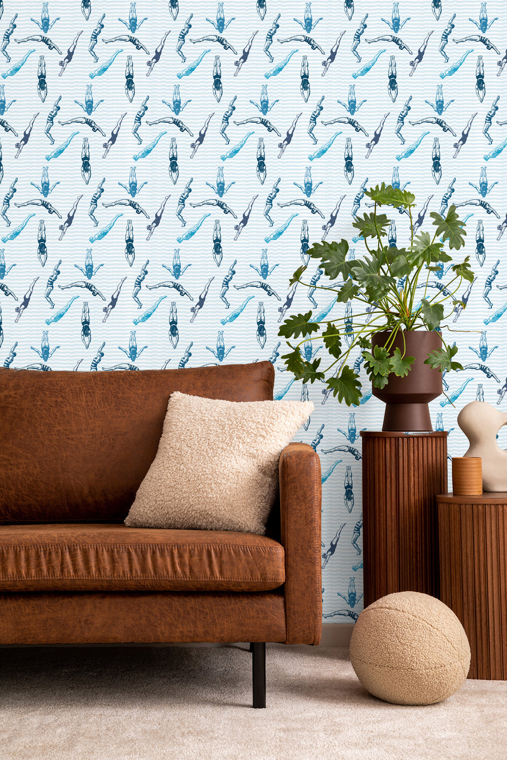 "Divers" wallpaper pattern offers a refreshing twist on the classic striped design, featuring original etchings of divers swimming through striped waves. This playful pattern is ideal for bold and fun spaces, such as a pool house, or any area that requires a touch of whimsy. The "Blues" colorway adds a nautical flair to any room, while the "Popsicle" colorway features a vibrant array of bright colors for an extra whimsical touch. Elevate your decor with "Divers" and enjoy a refreshing and playful ambiance in your home.