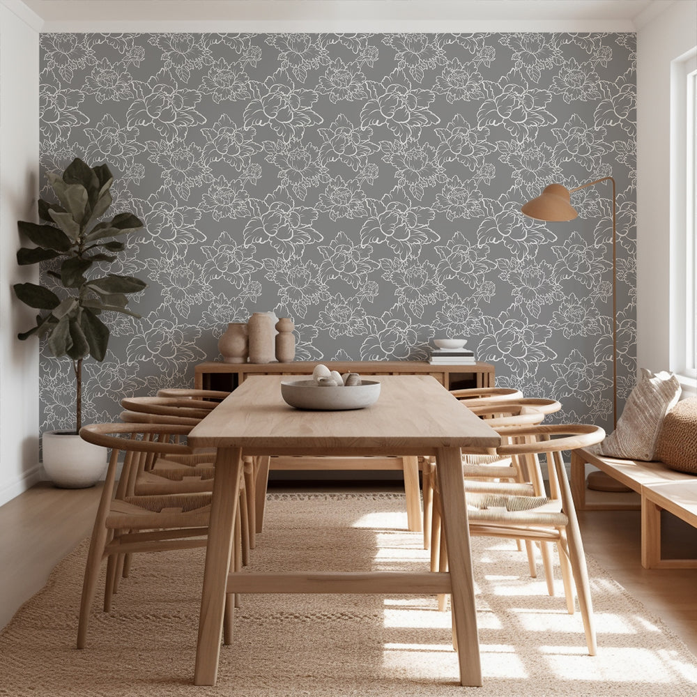Peony - Grey Floral Wallpaper by Bohemian Bungalow