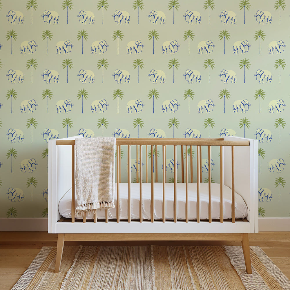 A refined yet playful design featuring elephants in gentle stride, paired with stately palm motifs. This pattern brings a sense of classic luxury and natural charm to any interior.